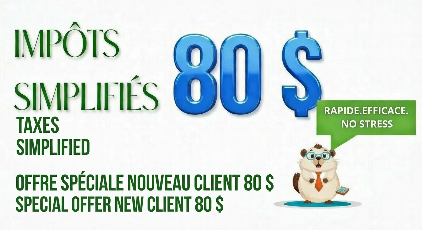 * Bénéficiez d’un tarif spécial de 80 $ par personne pour une déclaration incluant des revenus d'emploi, de pension ou de bourse d'études (excluant les revenus d'entreprise, de location, de placements et tout autre revenu non mentionné), à condition de déclarer en duo. Tout doit être fait 100 % en ligne via notre plateforme : remplissez le questionnaire client et téléchargez vos documents en toute simplicité !